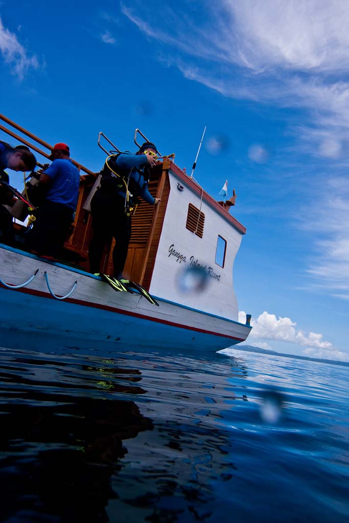 Arriving back at the surface the boat will quickly come and pick you up whilst offering an unusual perspective for a photo. A good aspect of North Sulawesi is the large number of dive sites and limited number of dive bases, meaning limited boat traffic, although it is always wise to careful look for local fishing boats - the most dangerous aspect of diving is surfacing, propeller blades are very unforgiving